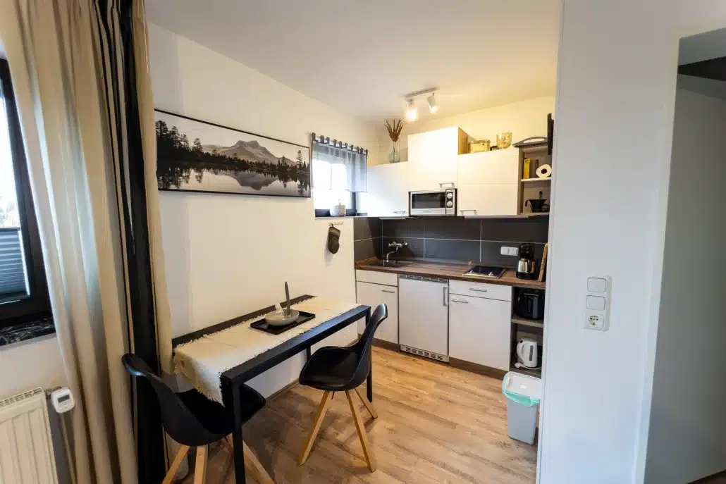 - Küche & Genuss: Selbstversorgung macht hier Spaß. Die integrierte Küchenzeile lässt keine Wünsche offen: Ob Kaffeemaschine, Toaster, Wasserkocher, Mikrowelle oder Kühlschrank mit Gefrierfach – am behaglichen Essplatz ist alles bereit für ein gemütliches Familienfrühstück.