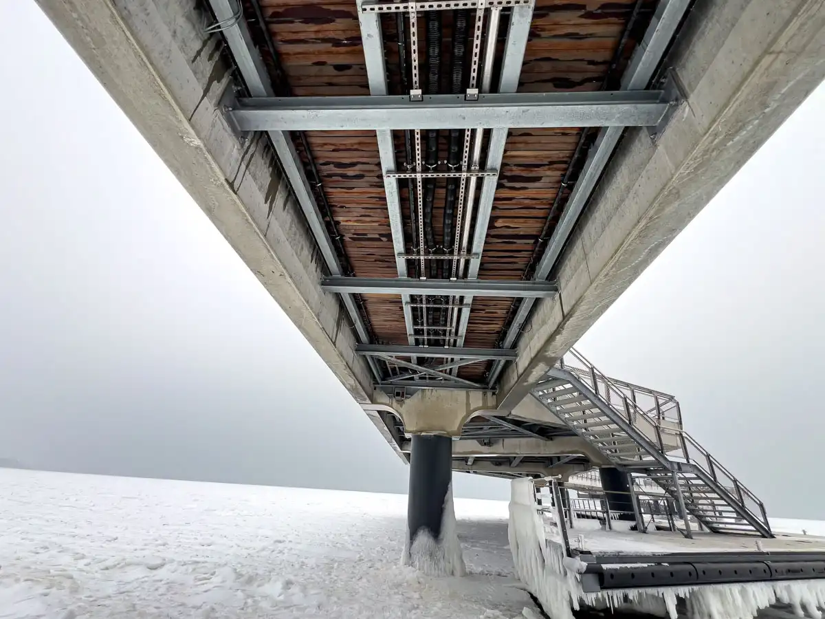 Wir waren für Sie mit der Kamera vor Ort. Schauen Sie sich diese Aufnahmen an. Sie entstanden direkt unter der Seebrücke von Haffkrug. Die Pfeiler sind von Eis umschlossen. Eiszapfen hängen herab. Es sieht aus wie in einer anderen Welt.